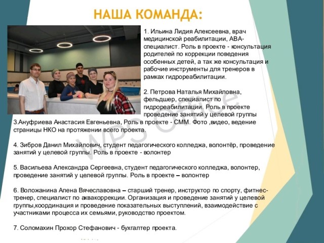 «Я невероятно счастлива, что наш проект победил и мы сможем организовать в Братске бассейн, предназначенный исключительно для занятий с особенными ребятишками! Процесс гидрореабилитации - это и ЛФК, и массаж, у детей улучшаются моторные функции, укрепляются мышцы, ведь в воде все делать легче, - рассказала руководитель проекта «Водный мир без границ» Алена Воложанина. - У ребятишек улучшается психоэмоциональное состояние, обмен веществ, детки начинают лучше спать. Вода теплая, это расслабляет, от плавания развиваются легкие и дети меньше болеют респираторными заболеваниями. И вообще, вода всегда приносит много удовольствия, ведь это весело и здорово!»