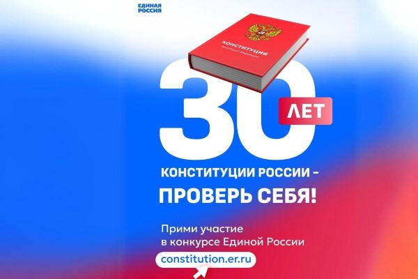 Онлайн-конкурс «30 лет Конституции России – проверь себя!», организованный партией «Единая Россия», продлили до 10 декабря. Любой желающий сможет пройти тестирование на сайте, состоящее из десяти вопросов. Основная цель конкурса – проверить знание основ Конституции и понимания конституционного устройства Российской Федерации.
