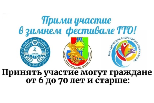 Жителей Братска от 6 до 70 лет (I-XVIII ступени) приглашают принять участие в зимнем фестивале ГТО. Заявки принимаются до 25 февраля 2024 года в Центральном районе города (отдел по спорту городской администрации) и в Падунском (СК «Сибирь»).