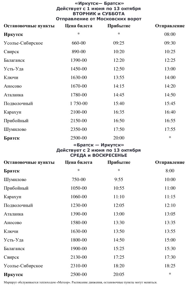 Первый в этом году «Метеор» из Иркутска в Братск отправится 1 июня, в обратную сторону — 2-го. По пути теплоход будет заходить ещё в несколько городов, а также в населённые пункты Братского района. Как следует из расписания движения транспорта, стоимость билета на «Метеор» из Братска до Иркутска составит 2,5 тысячи рублей. Время в пути — 12 часов. Из Братска в сторону Иркутска теплоход будет ходить по средам и воскресеньям. Из Иркутска в сторону Братска — по вторникам и субботам.