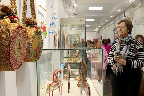 Елена БЕЛЕЦКАЯ, заведующая Художественным выставочным залом: «Традиционные росписи, традиционные ремёсла – это всегда наши корни. Потому что они всё равно использовались где-то в домах, где-то на утилитарных предметах, они и сейчас представлены вполне себе утилитарные многие вещи, но тогда действительно люди этим пользовались».