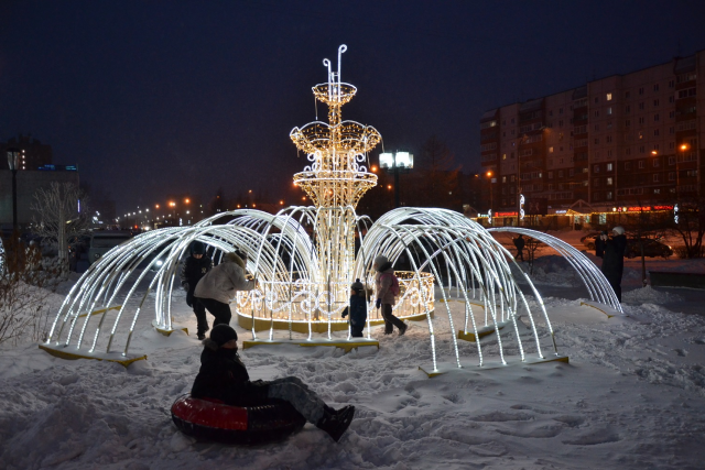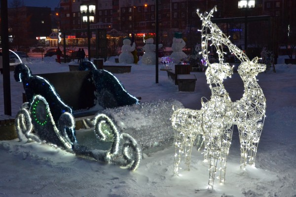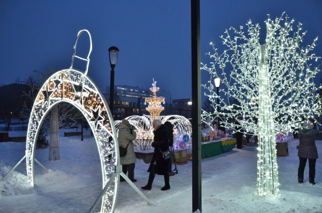 С 12 декабря для жителей засияли уже знакомые и любимые световые фигуры: снеговики, олени, деревья, сани, фонтан и не только. Вскоре свое место во главе широкой по-русски ярмарочной площади займет гигантский самовар. Все эти зоны - причина и повод выйти из домов и прогуляться всей семьей, принять участие в народных забавах, возможность сделать красивые фотографии с родными и сказочными персонажами.