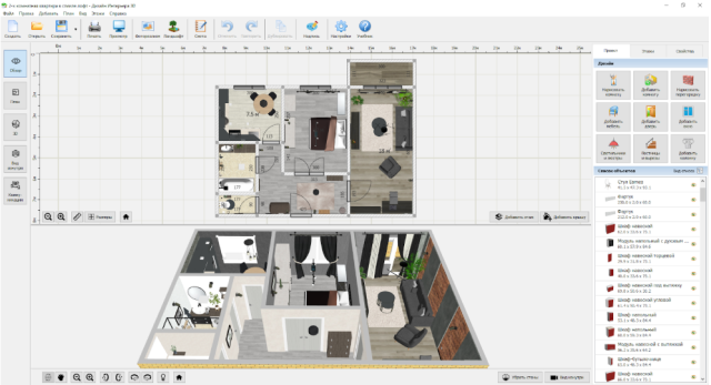 Полностью российская программа для дизайна квартиры, ориентированная на новичков и людей без технического бэкграунда. Тут можно сделать чертеж помещения, визуализировать интерьер в 3D и пройтись по нему от первого лица. В отличие от многих аналогов, это десктопное приложение, работающее без интернета.