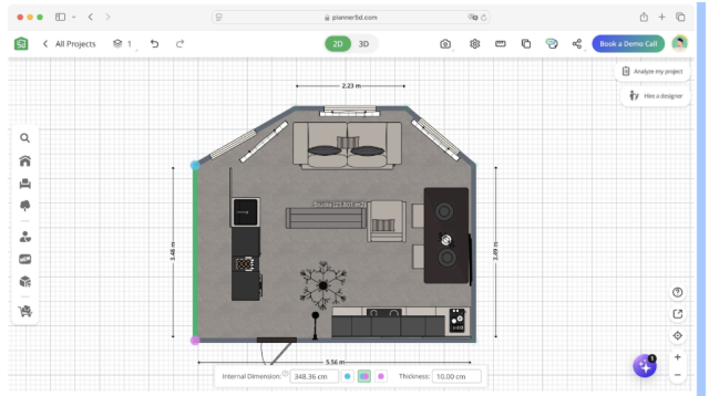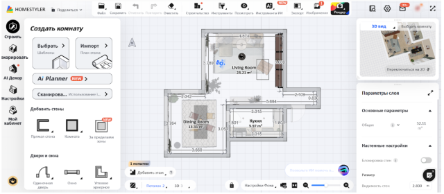 Planner 5D — кроссплатформенное приложение с ИИ-ассистентом. Оно ориентировано скорее на визуальную подачу, а не на инженерную точность. Программа позволяет оформлять не только интерьер, но и придомовую территорию, а также синхронизировать проект между ПК и смартфоном. Интерфейс интуитивен, но большинство продвинутых функций доступны только по подписке.