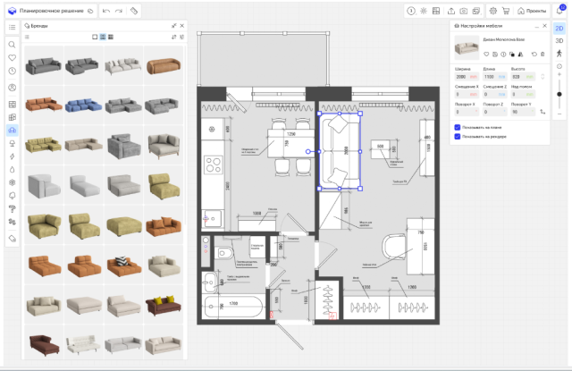 Планоплан — российское приложение для дизайна интерьера с VR-турами, каталогами реальных магазинов и возможностью совместной работы. Он входит в реестр отечественного ПО, что позволяет использовать его в госпроектах. Сервис особенно силен в подготовке документации: можно делать планы электрики, сантехники, отделки, развертки стен, сметы, спецификации. Все расчеты проводятся в облаке.