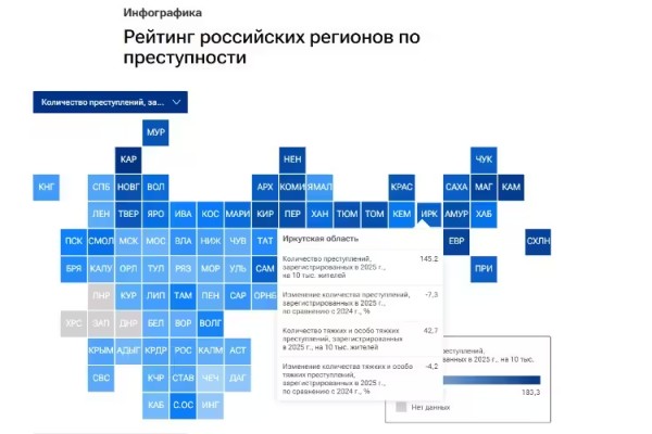 Иркутская область заняла 59-е место в общероссийском рейтинге уровня преступности. В 2025 году в регионе было зарегистрировано 145,2 преступления на 10 тысяч населения, что на 7,3% меньше, чем в 2024 году. Количество тяжких преступлений снизилось на 4,2%, до 42,7 на 10 тысяч жителей.
