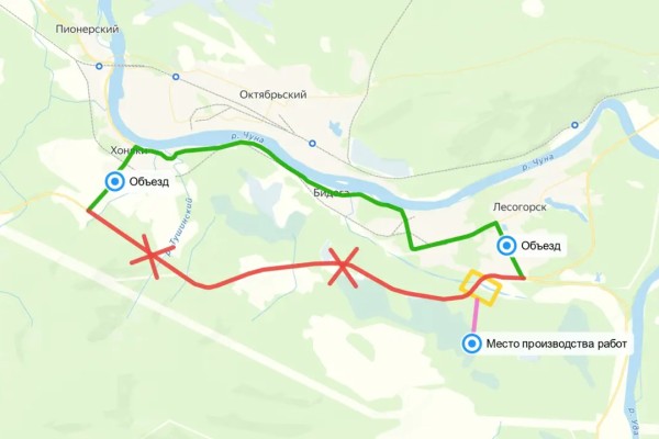 Перекрытие отрезка дороги связано с ремонтом водопропускной трубы. Обогнуть место работ можно будет через деревню Хоняки и посёлок Лесогорск, вдоль реки Чуна. В ближайшее время подрядная организация выставит временные дорожные знаки и информационные указатели объезда.