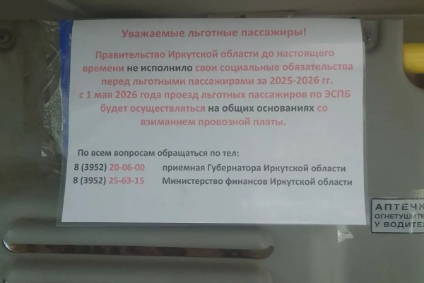 В объявлениях сказано, что Правительство Иркутской области не исполнило свои социальные обязательства перед льготниками. Поэтому владельцы электронных проездных билетов вынуждены будут оплачивать проезд на общих основаниях. По данным региональных СМИ, аналогичные объявления разместили и в автобусах областного центра.